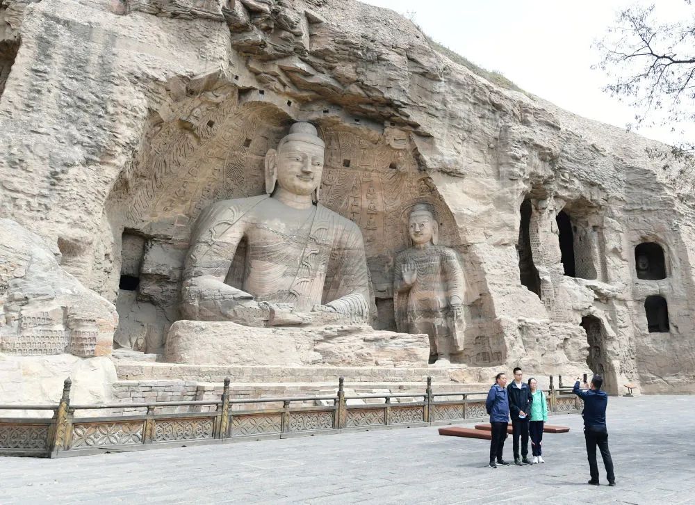 5月11日,游客在云冈石窟景区参观。新华社记者 杨晨光 摄 2020年5月,习近平总书记来到云冈石窟考察,仔细察看雕塑、壁画,不时向工作人员询问石窟历史文化遗产保护等情况。他强调,历史文化遗产是不可再生、不可替代的宝贵资源,要始终把保护放在第一位。今年1月,习近平总书记来到平遥古城考察,步行感受古城的历史点滴,登上城墙俯瞰全貌,在平遥县署了解古城历史沿革。总书记语重心长地说:“要敬畏历史、敬畏文化、敬畏生态”。“落实总书记的要求,我们成立了石质文物保护中心、数字化中心等机构,借力高科技加强对云冈石窟的保护。”云冈研究院党委书记张焯说,与此同时,正在加速构建和发展云冈学,充分发掘弘扬云冈石窟的文化价值,努力讲好云冈故事。