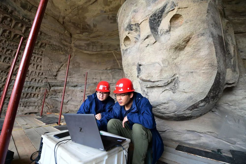 5月11日,云冈研究院工作人员孙波在云冈石窟第1窟进行文物保护专题直播。新华社记者 杨晨光 摄 云冈石窟的工作人员利用三维激光扫描和近景摄影测量等技术手段,对石窟信息进行全面采集,建立数字档案。截至目前,云冈石窟整体数字化信息采集工作已完成三分之一。在此基础上,研究人员借助3D打印技术,复制部分石窟和佛像,并实现异地展示,迈出了云冈石窟“行走”世界的步伐。